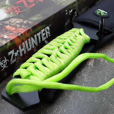 This a brand new outdoor hunting knife. It is a full tang black finished stainless steel with 7 inches sharp blade. The blade has upper serrated with gut hook. The handle part is wrapped with zombie green cord with an extended lanyard. The blade has red blood splash with couple of green dead zombies. It comes with belt loop nylon sheath with zombie hunter logo.